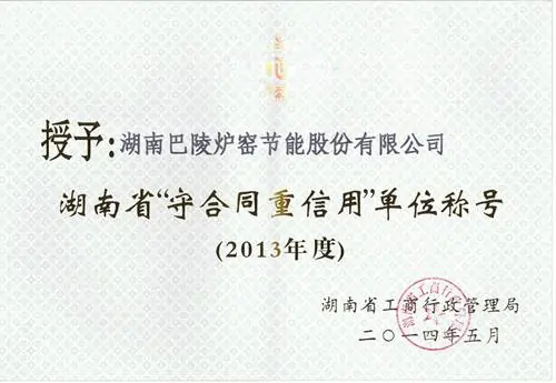 近日,湖南巴陵炉窑节能股份有限公司再获湖南省工商行政管理局颁发的湖南省“守合同重信用”单位荣誉称号(2013年度)。这是我公司连续3年获得此项荣誉。